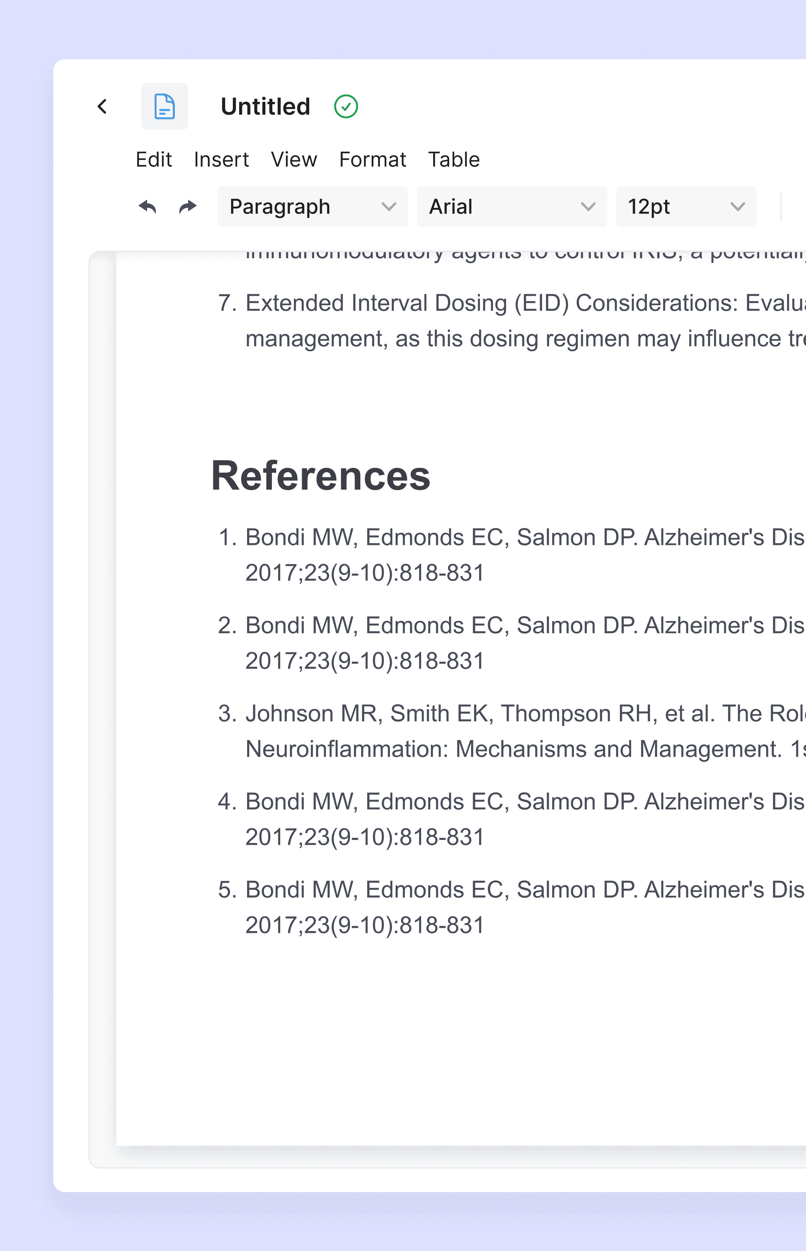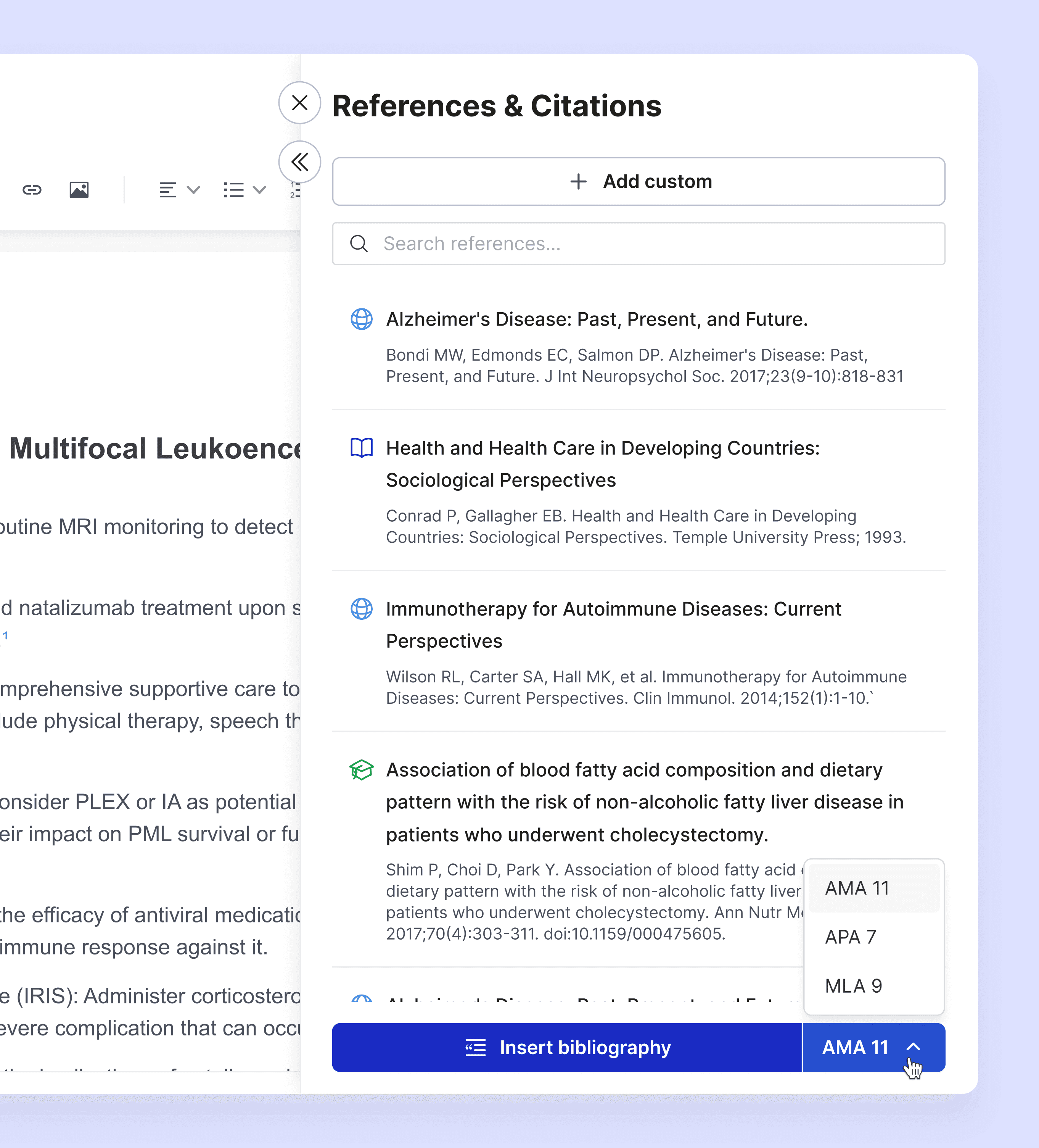 Switch citation styles (AMA, APA, MLA) or generate a reference list using the Citation Generator after transferring your draft to the Editor. All citations stay synchronized with your content, updating automatically as you edit and rearrange text.