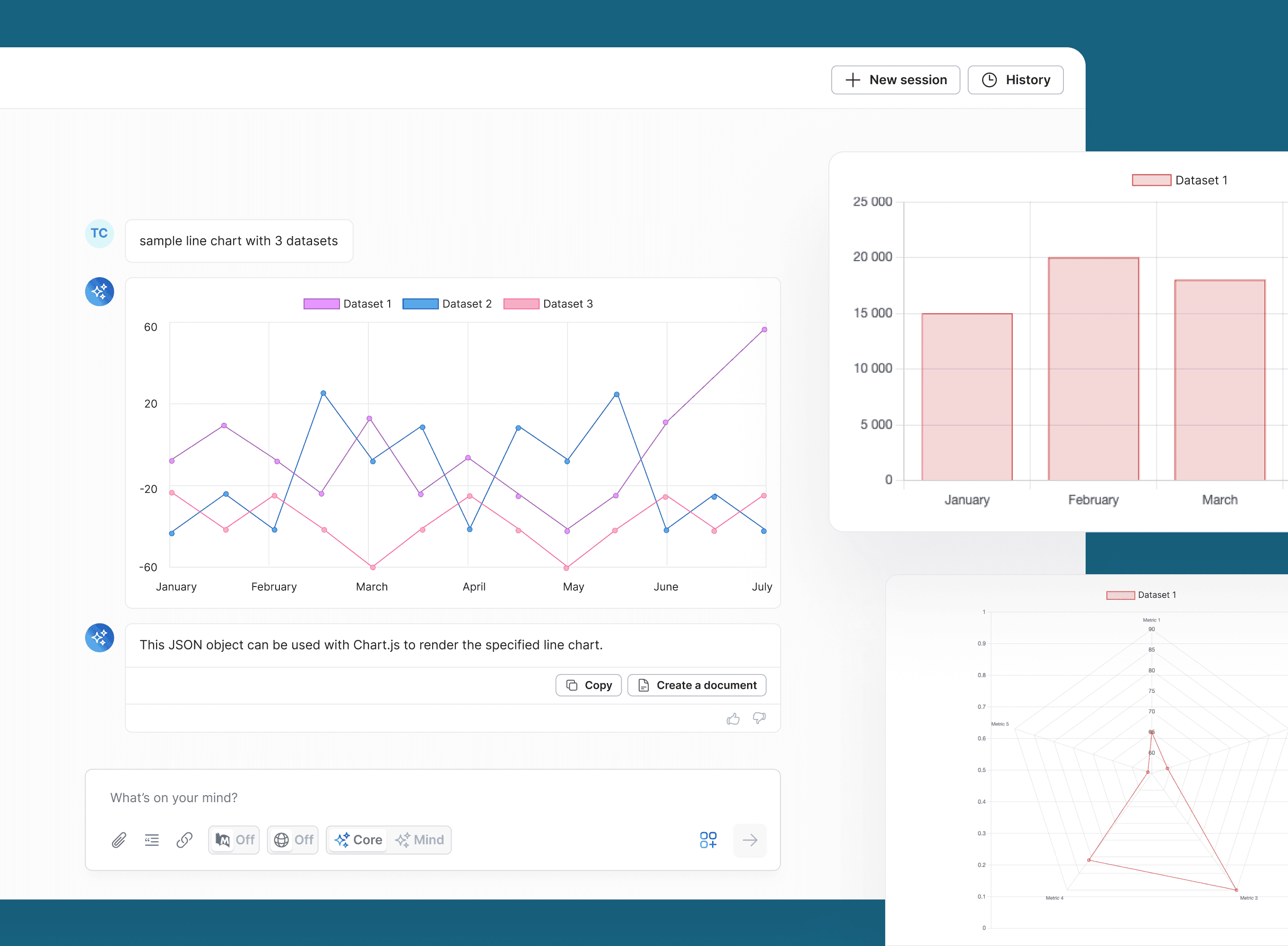 - Data-aware visuals: create from evidence tables, saved datasets, or chat instructions.