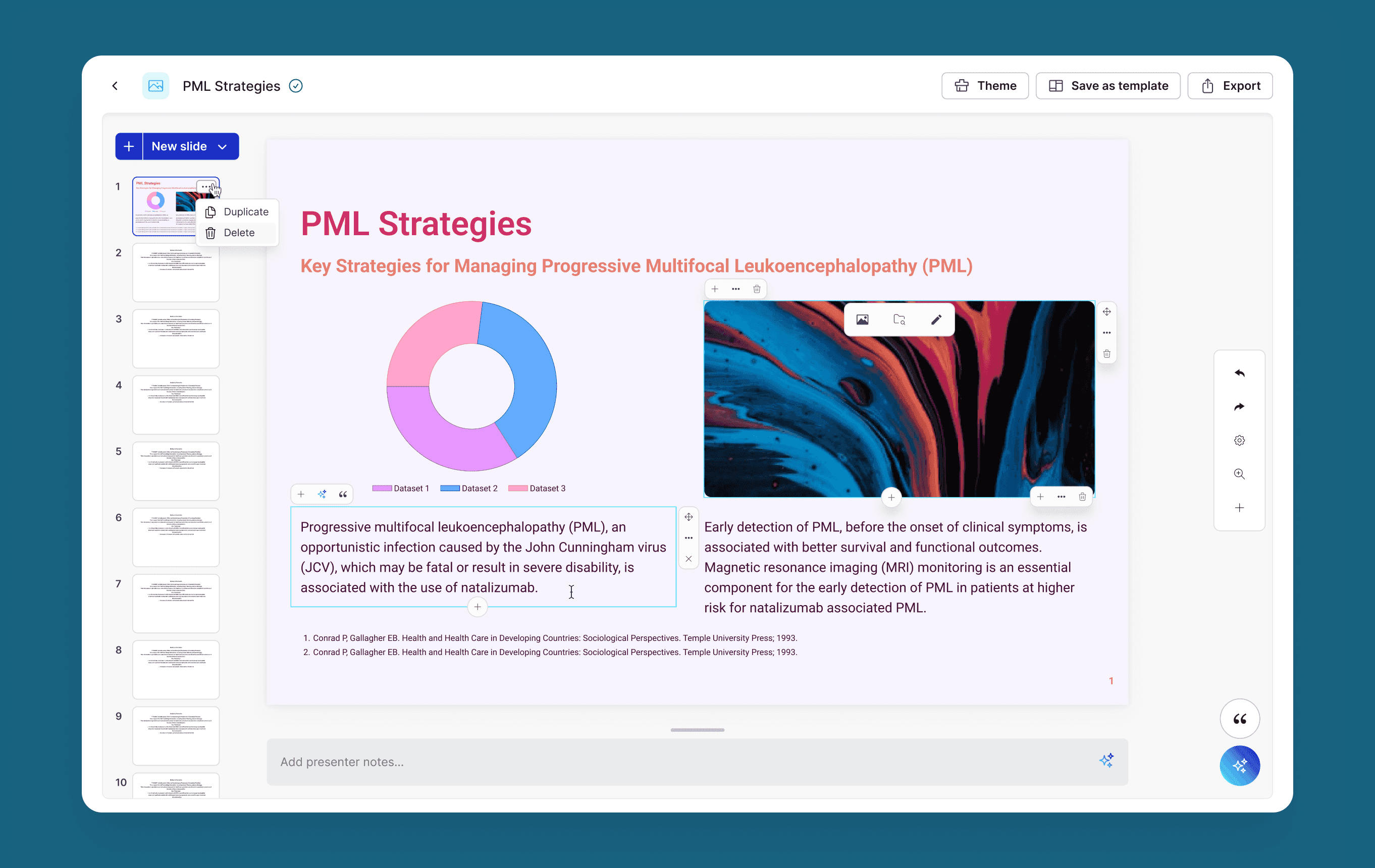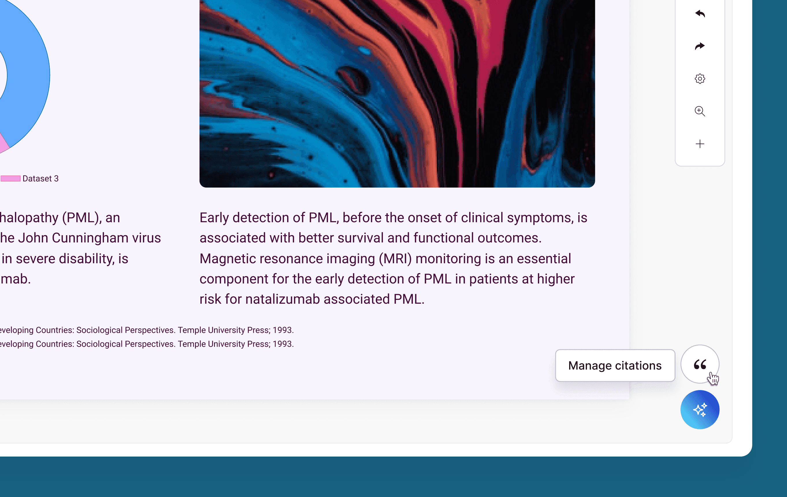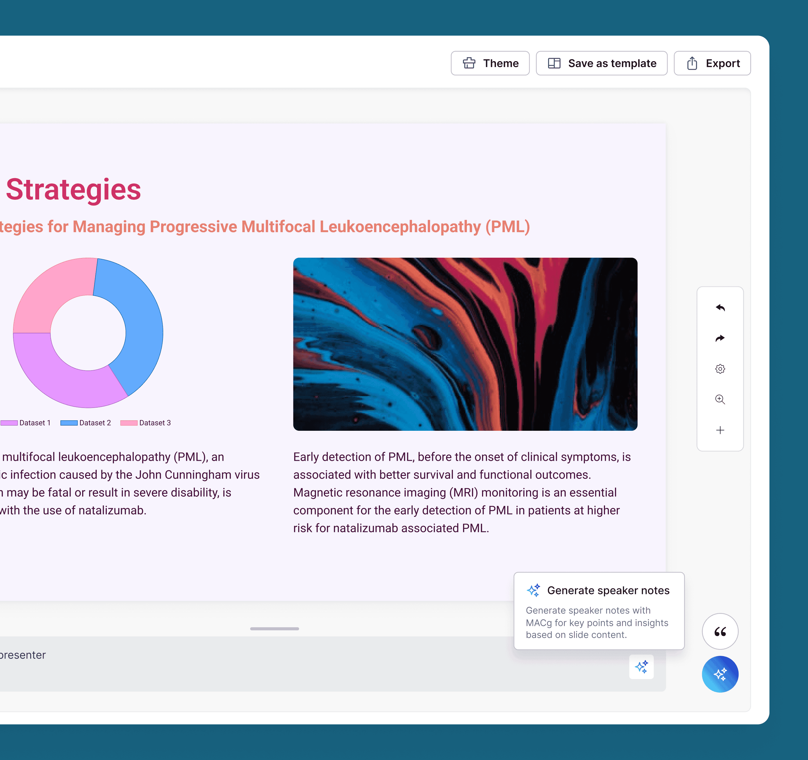- Evidence-first visuals: pull data and context from Reference Collections and PubMed-backed summaries.