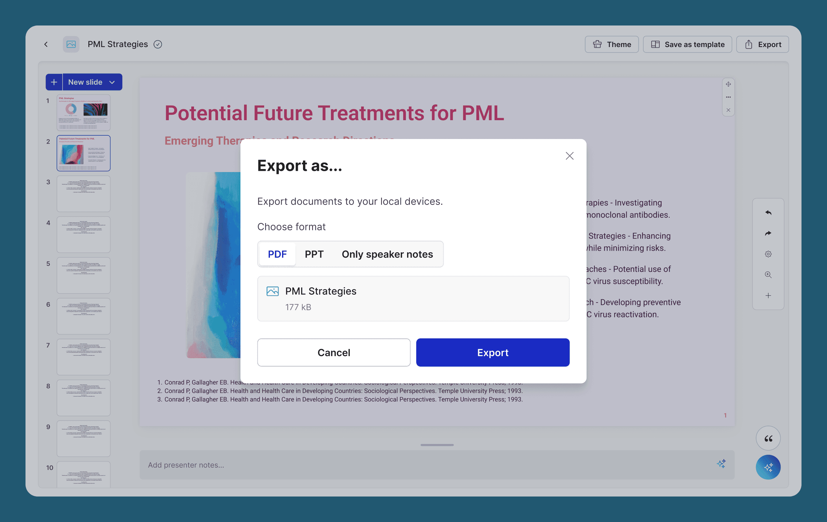 Slide Presentation Tool: convert visuals into editable decks with per-slide citations, speaker notes, and PPTX export.