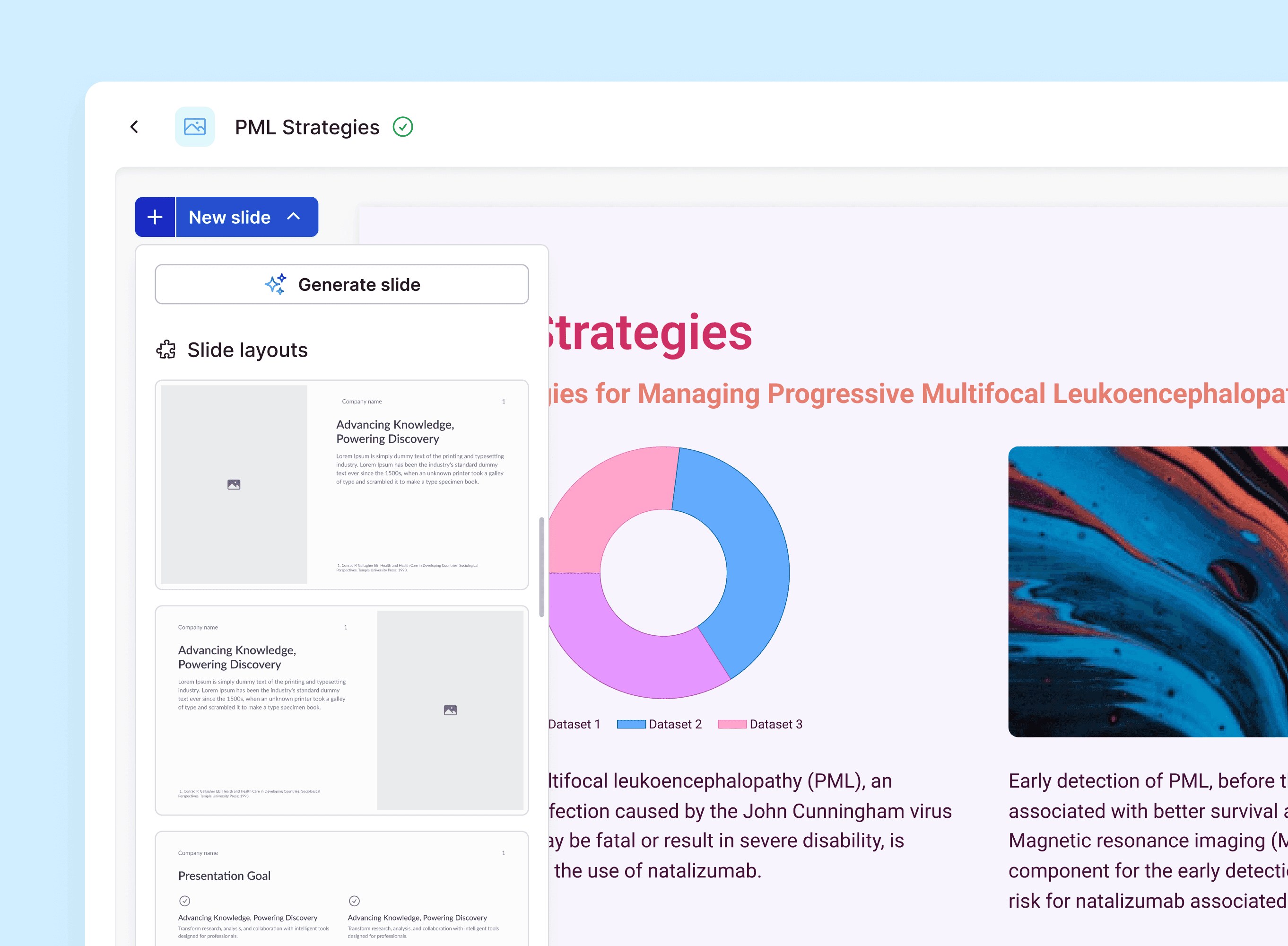 Build slides with per-slide citations; export to PowerPoint/PDF.