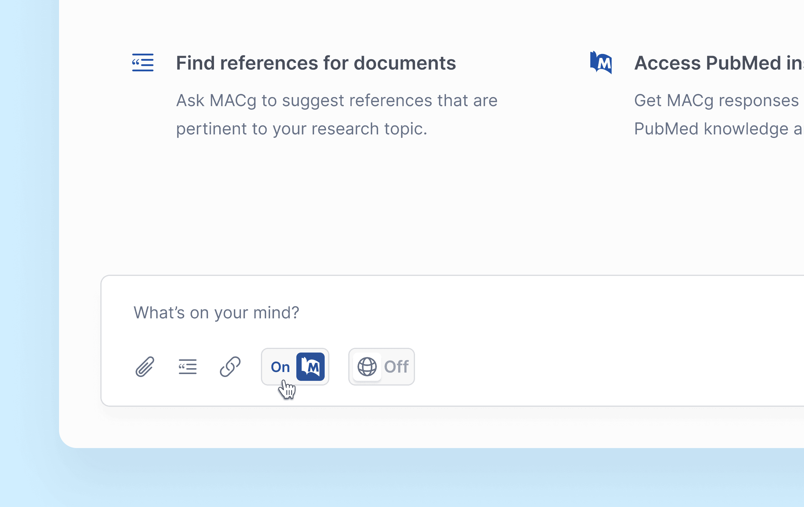 MACg turns natural-language questions into precise PubMed queries, screens results with AI, and generates study summaries and evidence tables linked to your Library.