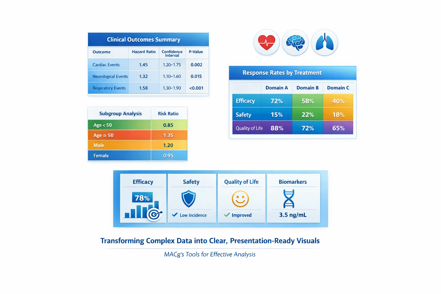 This article is a practical guide for MACg users who want to create beautiful, slide-ready tables from clinical and scientific data. It explains why the first slide output doesn't need to be perfect and shows how to iterate like a pro using MACg's image generator and flexible slide builder. The core of the article is a set of 10 copy‑pasteable prompt templates for different table styles, from primary outcomes and safety summaries to subgroup grids and multi-domain overviews. It also emphasizes attaching or pasting datasets so MACg can generate accurate, presentation-ready visuals.
