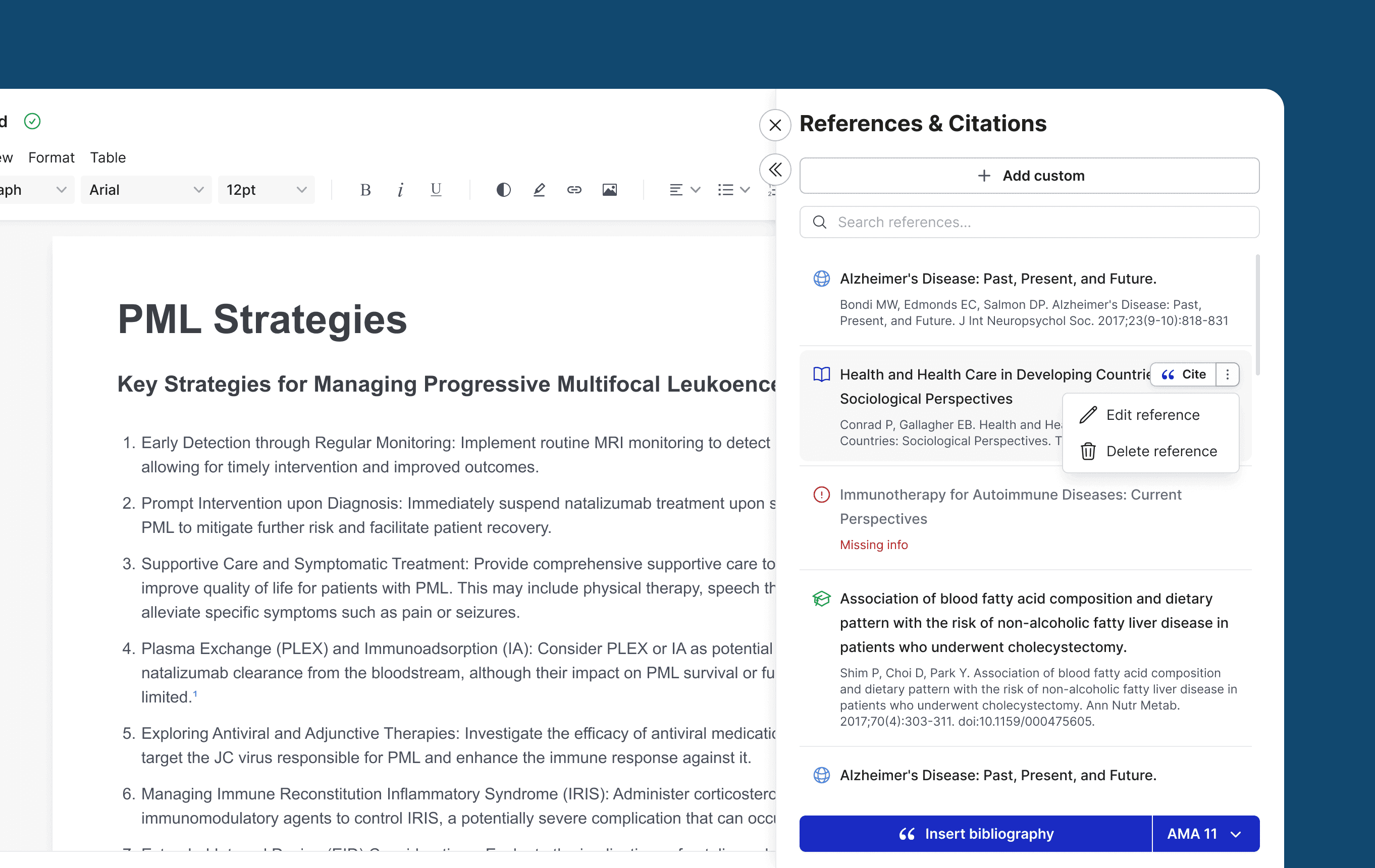 Auto-update logic: when you move or edit text, citation numbering and the bibliography reflow automatically.