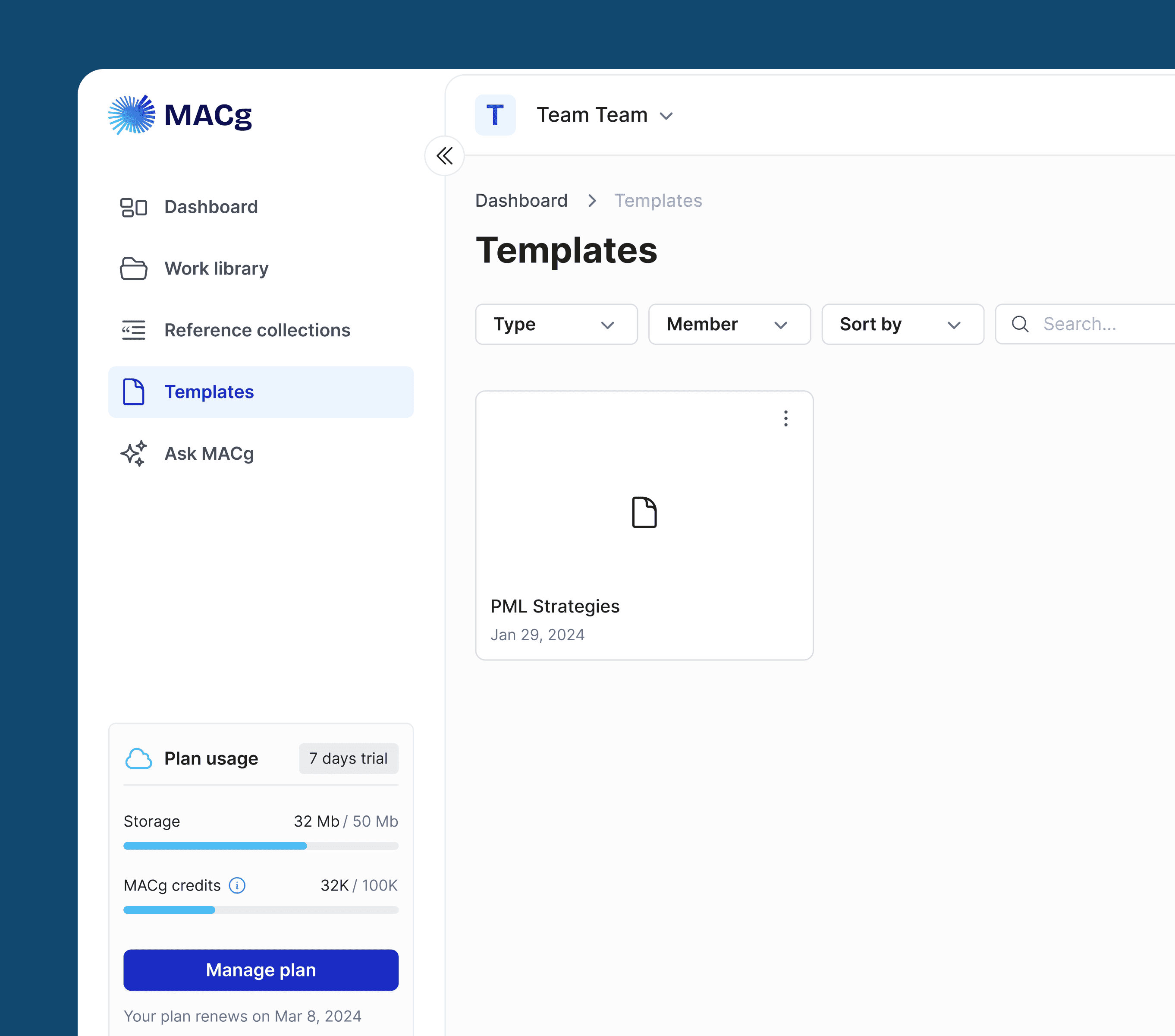 It's integrated with the Citation Generator, so citations are inserted instantly and auto-renumbered as you edit. Each section maps back to its Ask MACg discussion for context, autosaves to your Work folder, and can be standardized with reusable, branded templates.