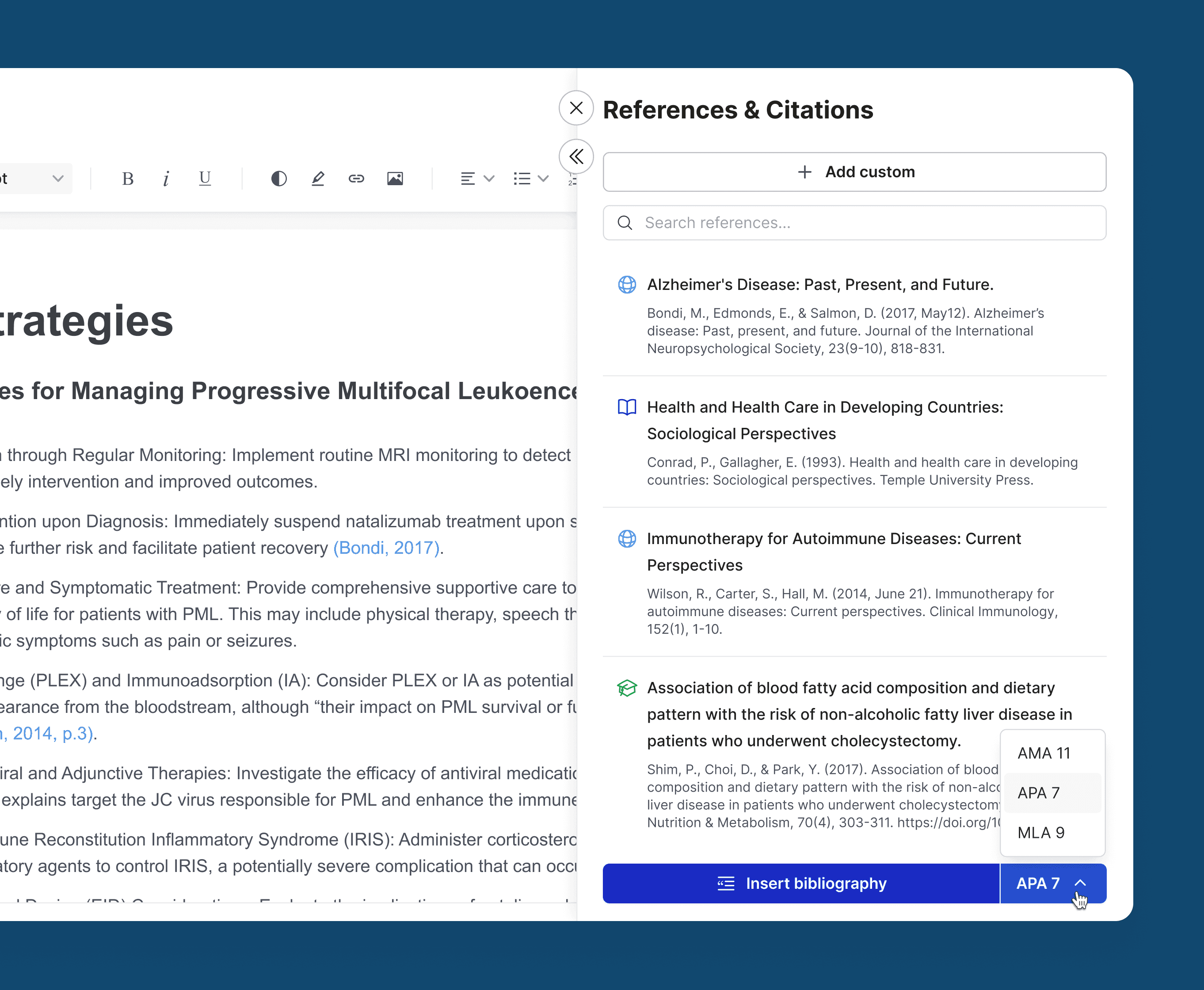 Style switching: toggle AMA, APA, or MLA at any stage — the editor updates in seconds.